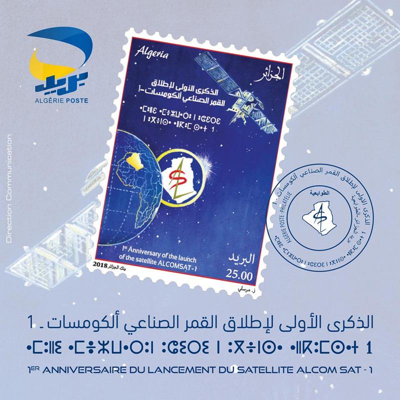 بمرور سنة كاملة أحتفلت بريد الجزائر بطريقتها الخاصة عن طريق اصدار طابع بريدي يحمل صورة القمر ألكومسات-1.